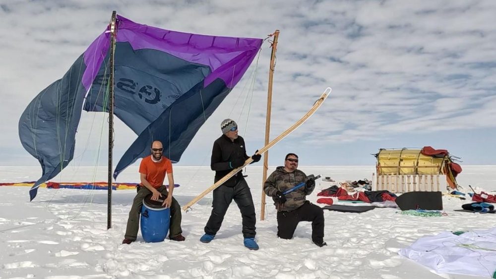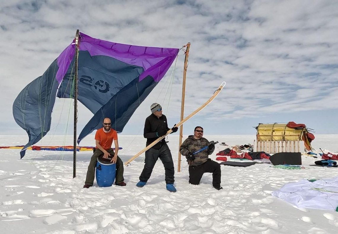 EN LA FOTO, Ramón Larramendi y dos de sus compañeros en la última expedición a Groenlandia celebran el éxito de la travesía, con los travesaños del Trineo de Viento.